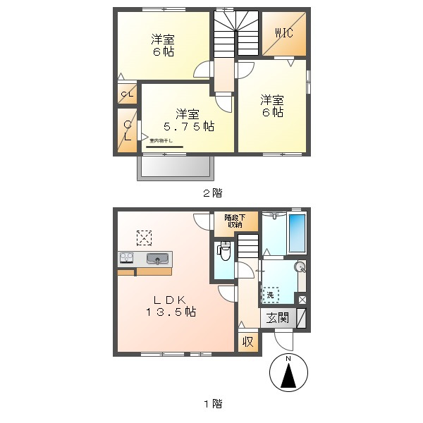 LDK 13.5帖 1室/洋室 6.0帖 2室/洋室 5.7帖 1室 - 向き