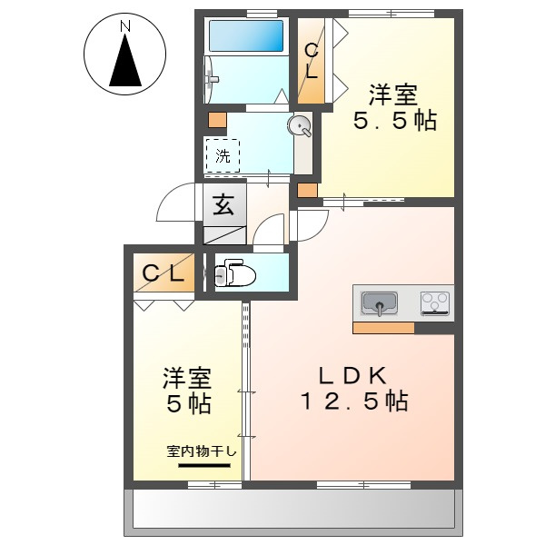 LDK 12.5帖 1室/洋室 5.5帖 1室/洋室 5.0帖 1室 - 向き